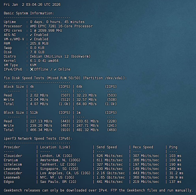 不像很多免费机用的是十几年前的 Atom 或老志强,ICMP9 分配的是 AMD EPYC 处理器。